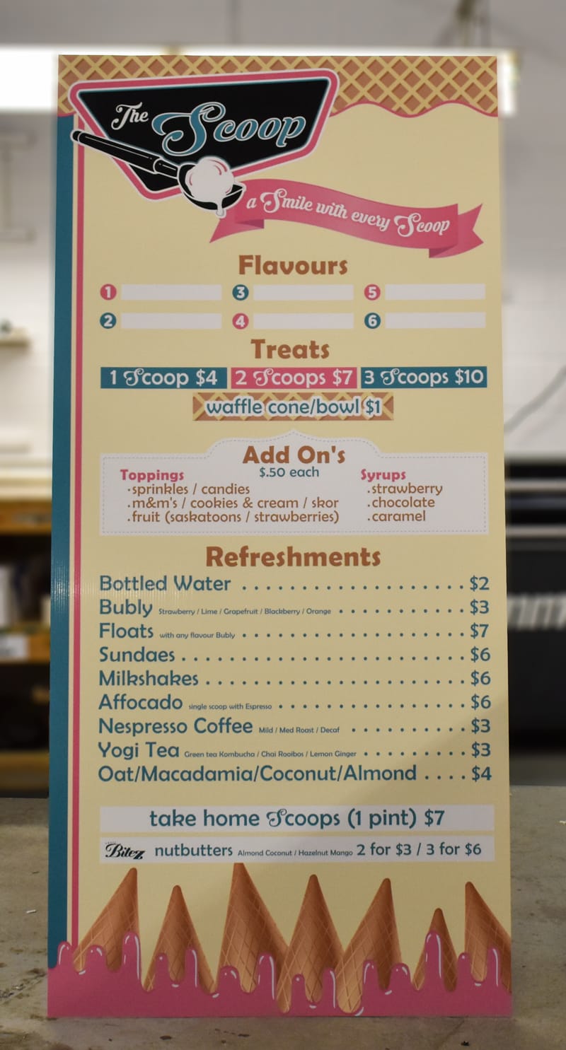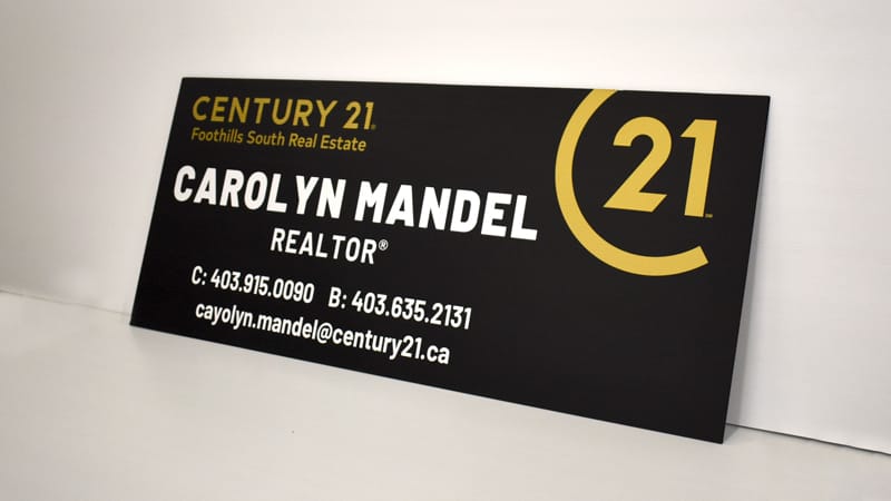 Polystyrene is a lightweight product that has a nice smooth finish. It is used for indoor signage because it looks professional and is easy to install on walls or display on counter tops. Cut vinyl can be used or we can do a full color print.