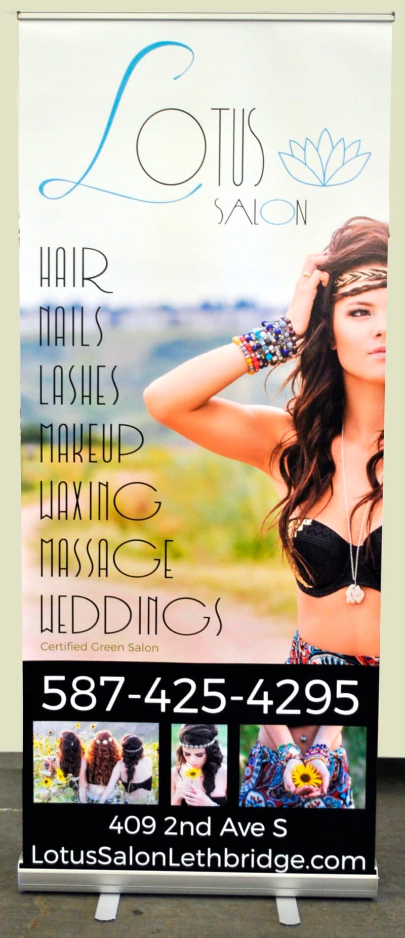 For banners without the stand, the edges can be hemmed and grommets are put along the edges so that they can be hung up anywhere. We also specialize in making some heavy duty wind resistant banners. We use a very thick material, heat seam the edges, and use a rope and pole system to take the stress away from the grommets, which is where outdoor banners usually tend to have their weakness.